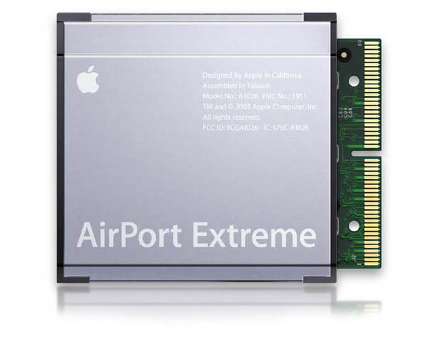 Apple 54Mb/sec 802.11g Airport Extreme wireless networking card for newer Apple laptops and desktop. See below for a list of Apple models that require this type of Airport card. Note that for use in a PowerMac G5, you will require the external antenna.Also note that although this card is generally used in the PowerMac G4 Mirror Door FireWire 800 range, the very last model Apple produced, the 2003 1.25GHz single processor version, reverted to using the original 11MB/s Airport card, not this one. Being 802.11b and g standard compliant means that this card is fully compatible with 3rd parts routers and wireless access points as well as Apple's own Airport base stations. Full backwards compatibility with 11Mbps 802.11b routers.