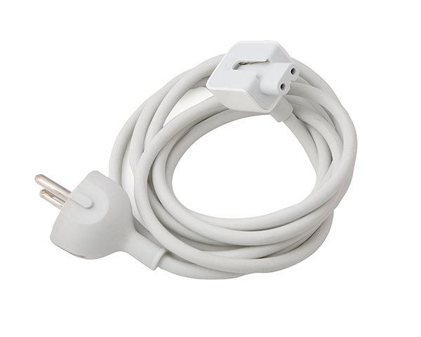 Original EU two round pin Apple mains lead for white block iBook, PowerBook power supply units (IB4PSU), and the MacBook and MacBook Pro power supplies. The modified figure of 8 connector forms one corner of the power supply block and completes it's shape when connected. This lead is NOT suitable for the silver plug versions (IB3PSU) of the 45w iBook/PowerBook adapter as this contain the traditional figure of 8 mains socket which will not accomodate this lead.
