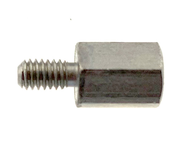 Set of two original Apple hexagonal metal modem board standoffs for the PowerBook 100 series. Two of these fit between the logic board and modem board. Total length 10.8mm, standoff height 6.4mm.