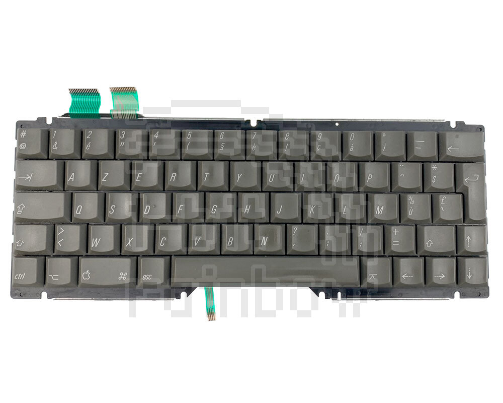 Original Apple, fully working, French AZERTY layout internal keyboard module for the PowerBook 1XX series excluding the 100 and 190. This keyboard is functionally interchangeable with the keyboard that shipped on the PowerBook 150 although that keyboard used a different keycap mechanism and slightly different keycap plastic.