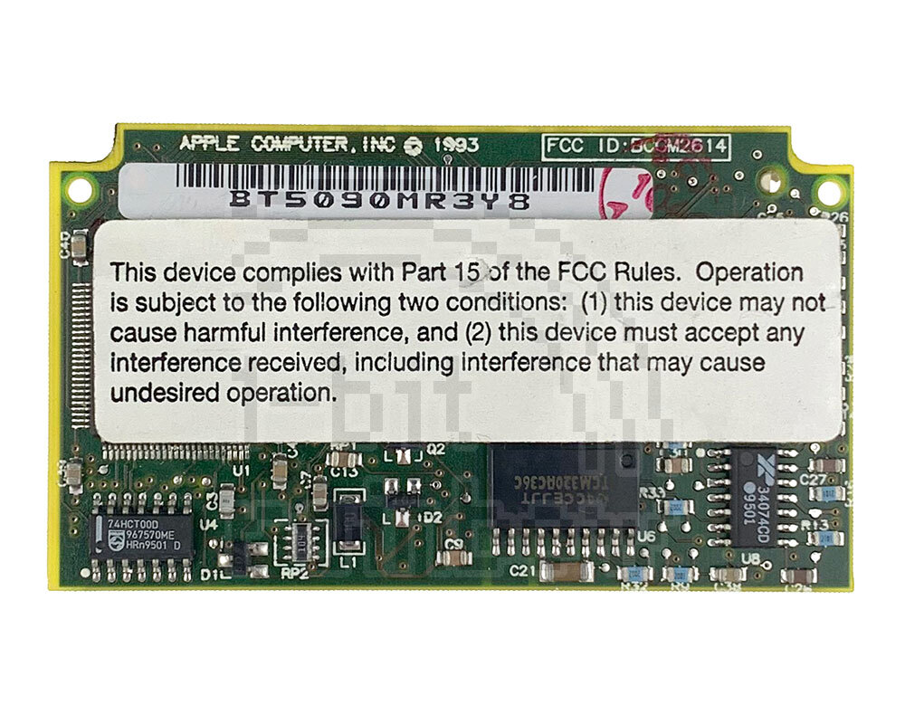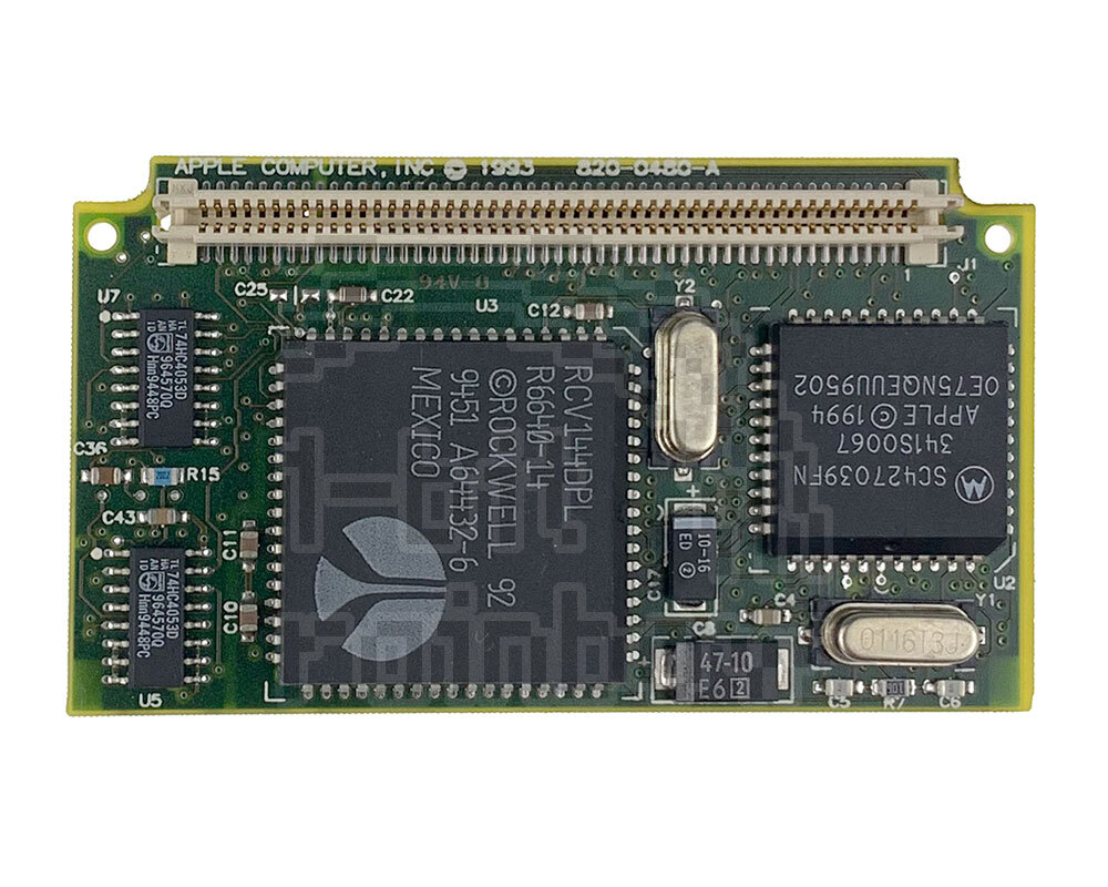 Original Apple, internal modem board for the PowerBook 500 series. This board connects to the logic board alongside the processor board and provides the core modem functionality. It is separate from the DAA board which provides a region specific modem port on the rear panel.