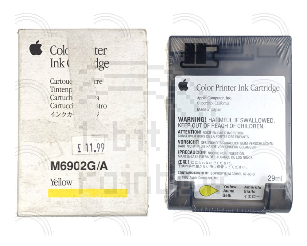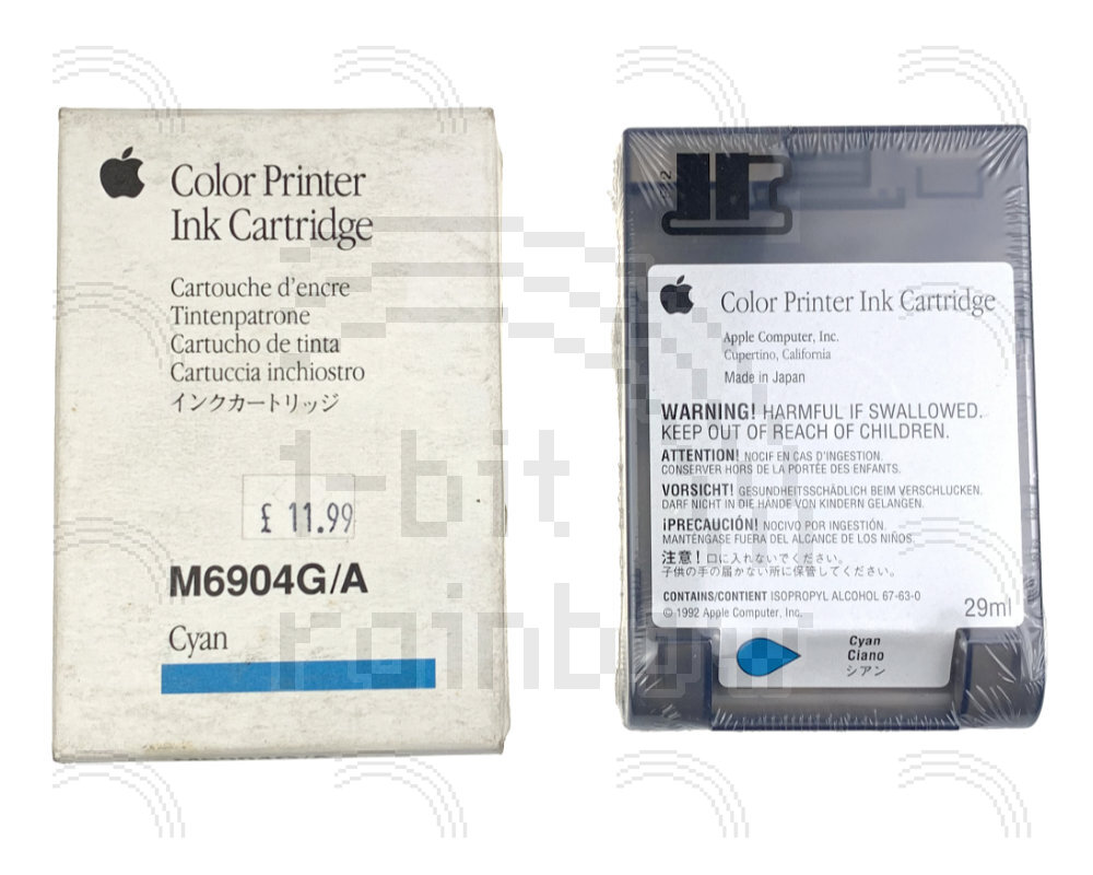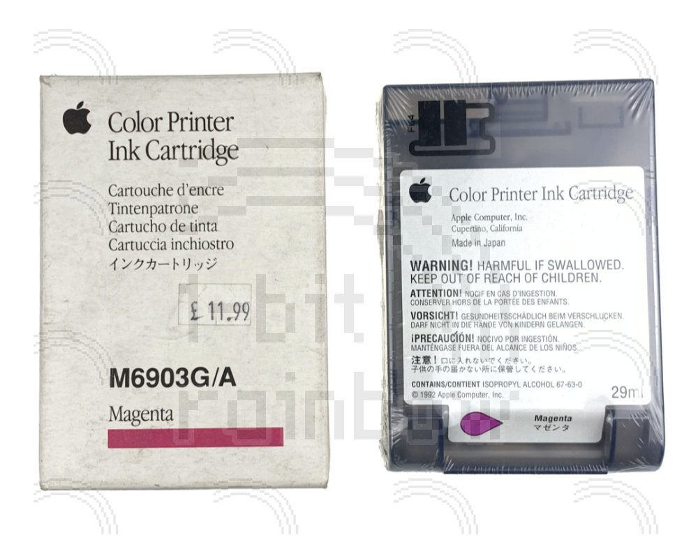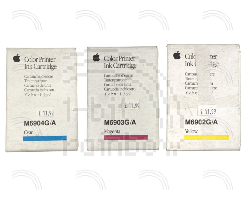 New old stock, boxed, sealed cyan, magenta and yellow ink cartridges for the Apple Color Printer (M9500). Launched in 1993, this was Apple's first colour inkjet printer and was a rebadged Canon BJC-820. It used four separate ink cartridges; cyan, magenta, yellow and black (this set does not include a black cartridge).