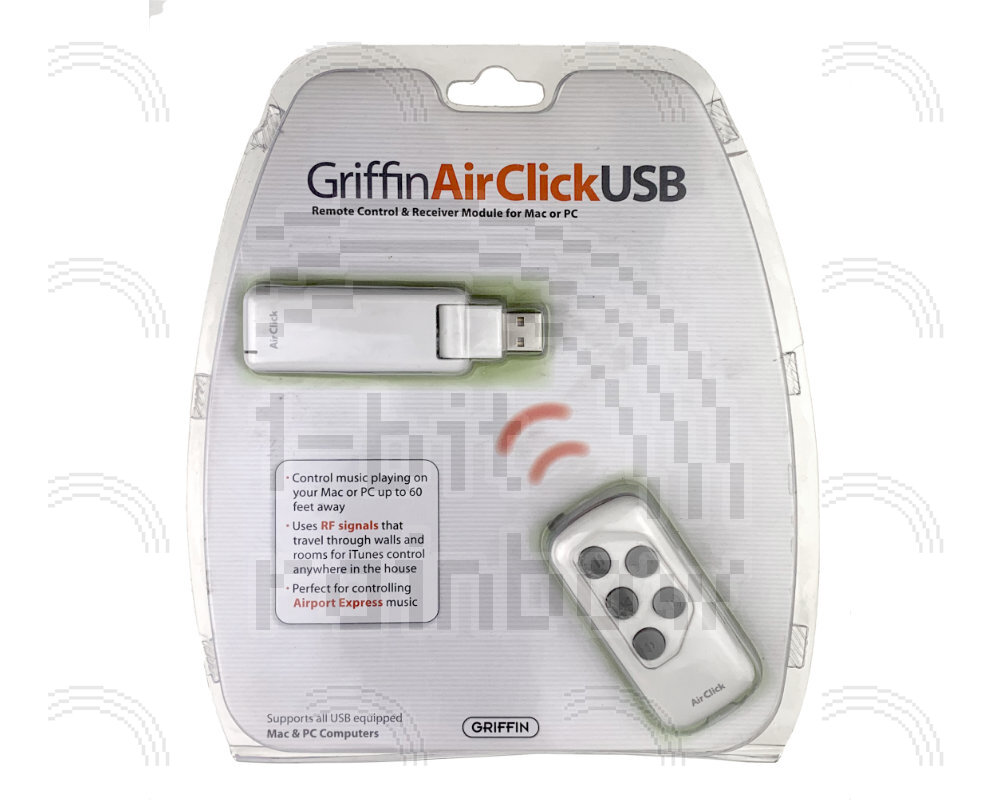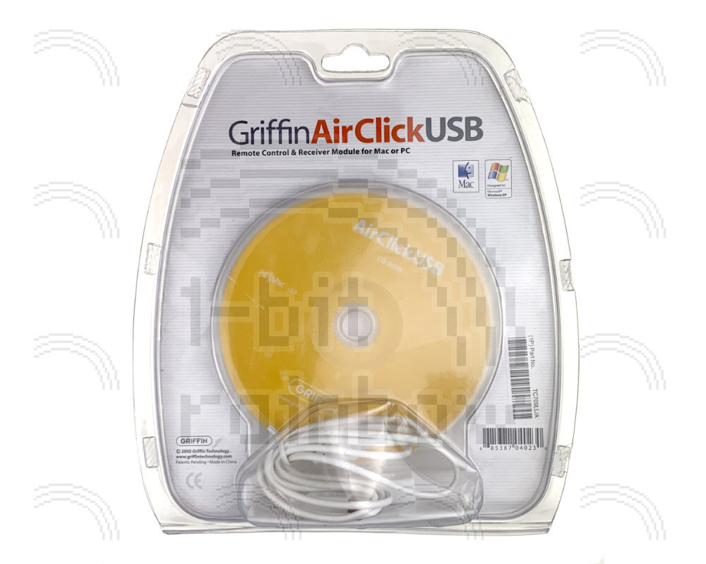 New old stock, Griffin AirClick USB, a USB receiver/remote-control combination that allows you to remotely control applications on your Mac or Windows PC via radio frequency (RF). Released in 2005, it includes the AirClick remote control (also found in Griffin’s other AirClick products), the AirClick receiver module, which is a bit wider and thicker than a USB key drive; a CD that contains versions of the AirClick USB software for Mac and Windows; and a USB extension cable.