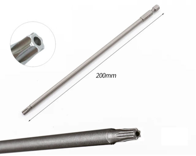 New, 200mm long T15 security Torx screwdriver bit with standard 1/4inch hex mount and magnetic tip. This allows deep recessed screws to be accessed with ease, in particular the two case screws located deep within the carry handle recess of the Macintosh 128K, 512K, Plus, SE, SE/30, Classic and Classic II.